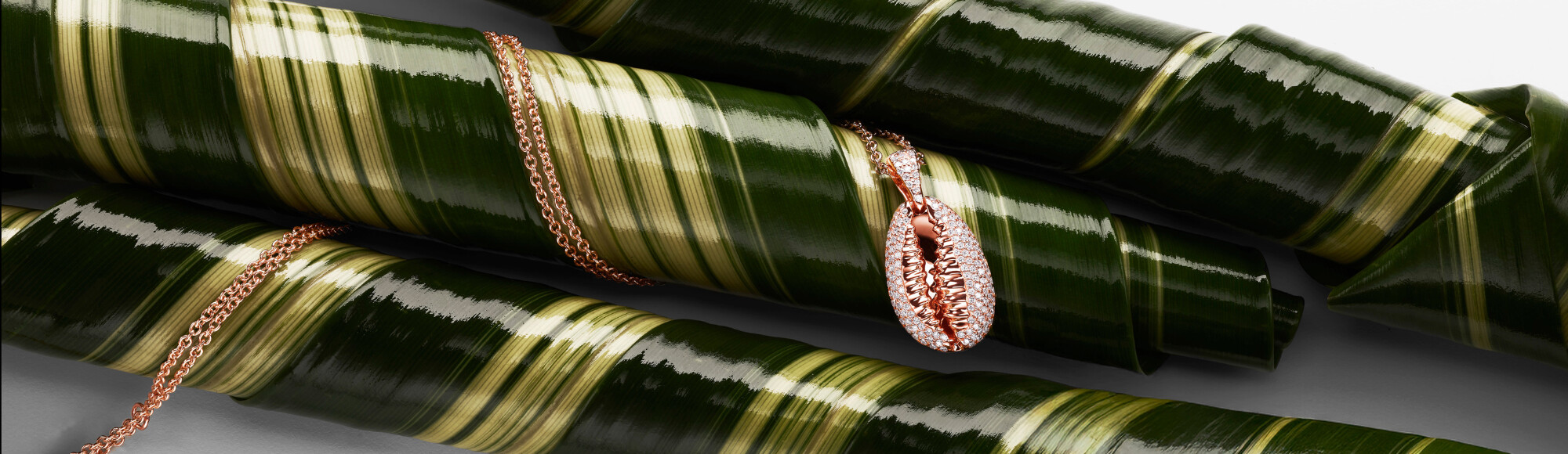Symbole de bonne fortune, de beauté et de bonheur ce petit coquillage servait de monnaie d’échange dans la nuit des temps. Immédiatement identifiable, sa forme à la fois concave et convexe prête le flan à des pendentifs, bagues et bracelets féminins et sensuels que le joaillier a conçu pour qu’ils puissent être portés en accumulation. En or jaune, blanc ou rose, sertis ou non de diamants, les cauris attrapent la lumière comme le soleil caresse la surface de la mer.