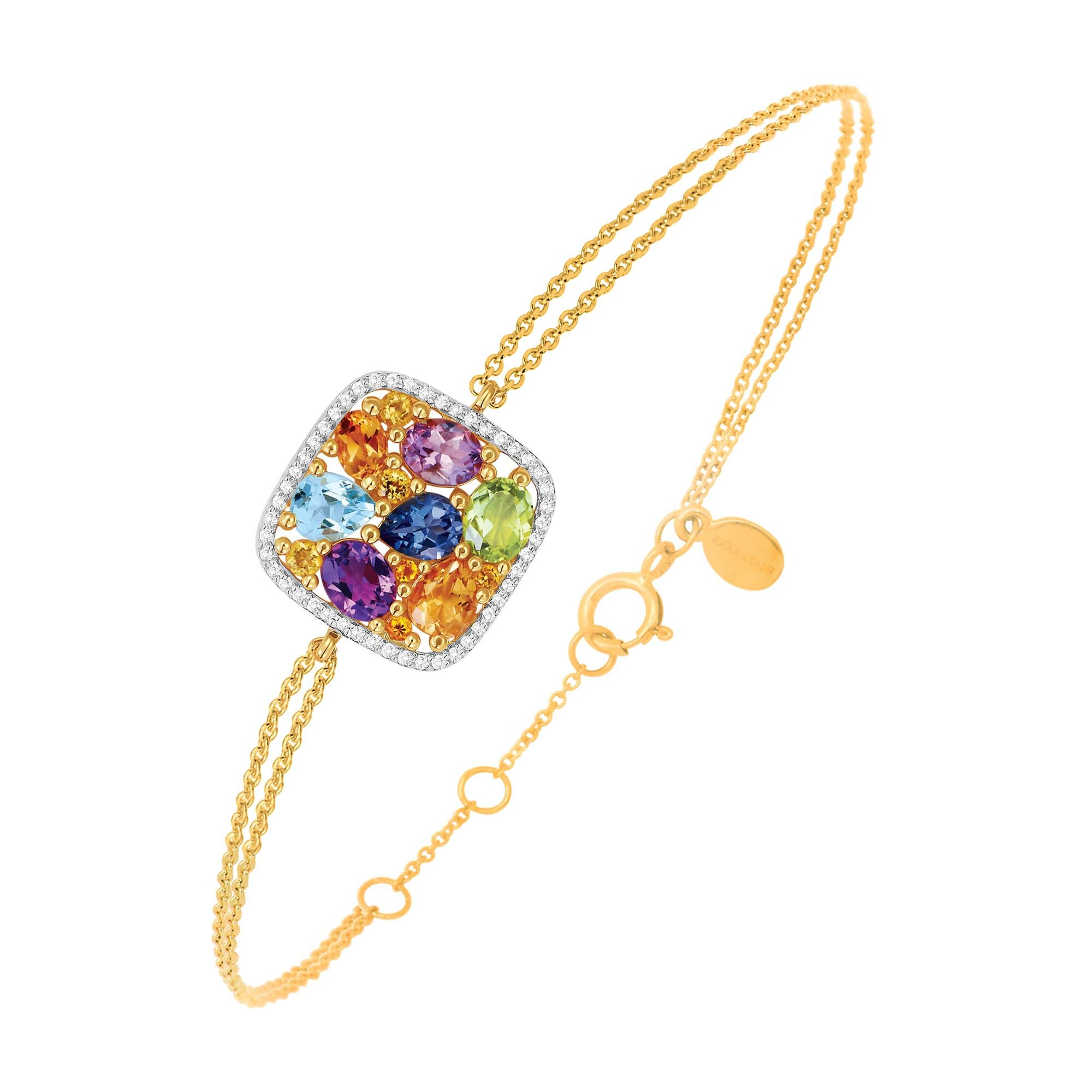 Ce bracelet en or jaune 18 carats est sublimé par des diamants scintillants et des pierres multicolores aux lignes carrées. Chaque gemme, soigneusement sélectionnée, apporte une touche de couleur. Parfait à assortir avec le collier et les boucles d’oreilles pour un ensemble coordonné.