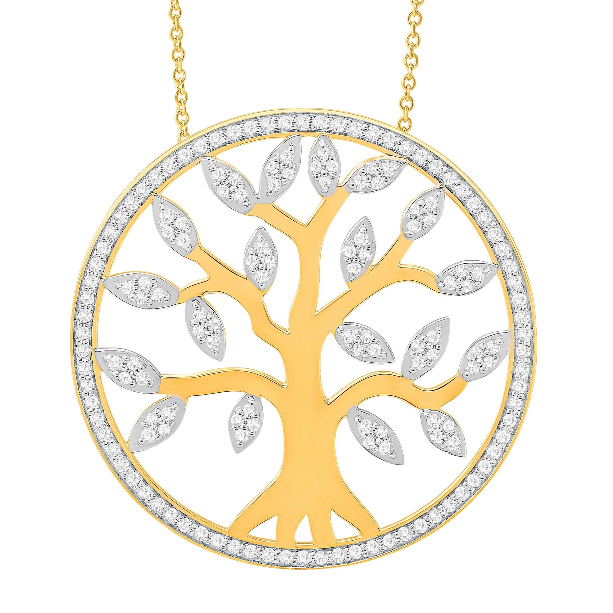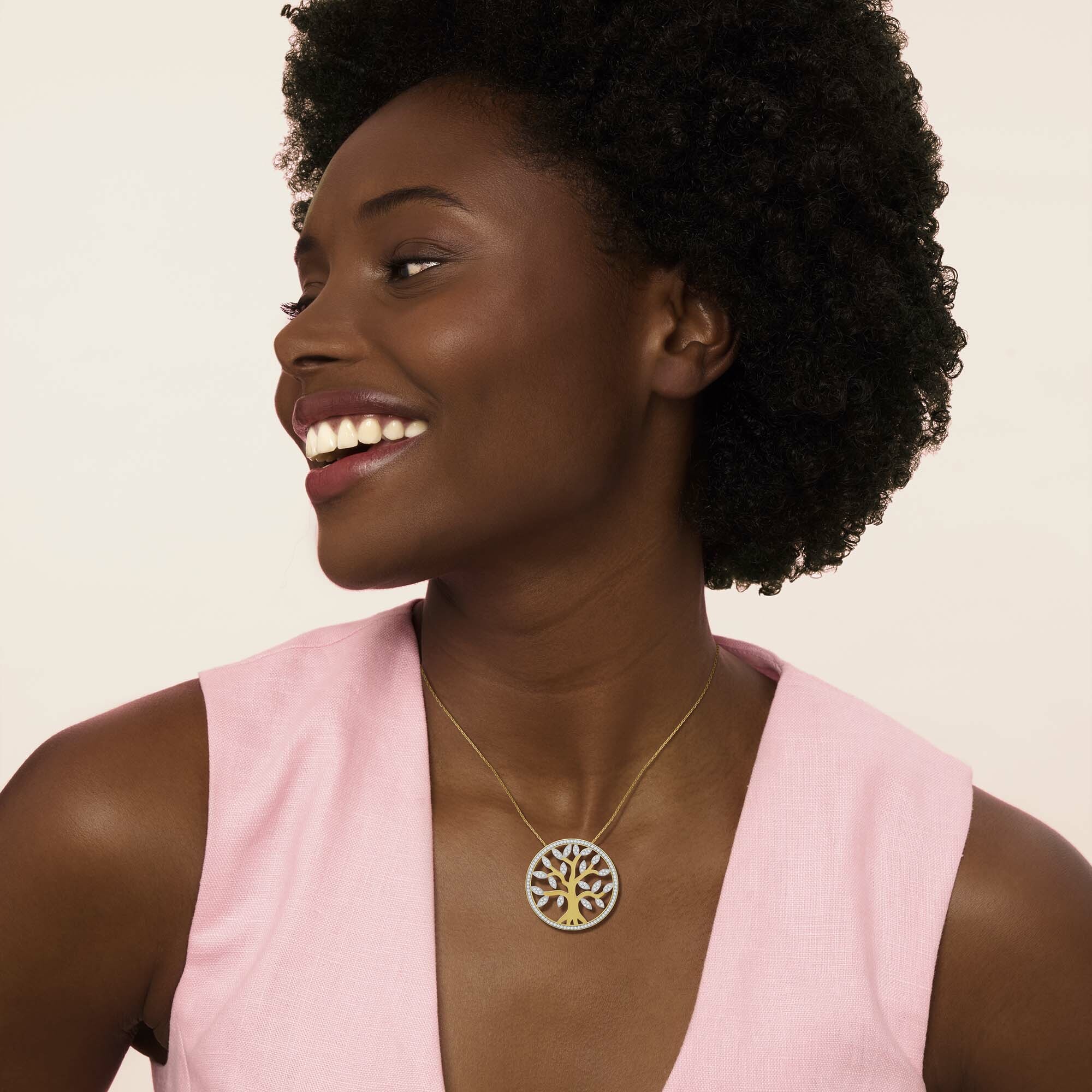 Le collier Arbre de Vie sublime la perfection de l’or jaune par un pavage de diamants éclatants. Chaque feuille semble capturer la lumière. Il célèbre la féminité rayonnante et la grâce intemporelle.