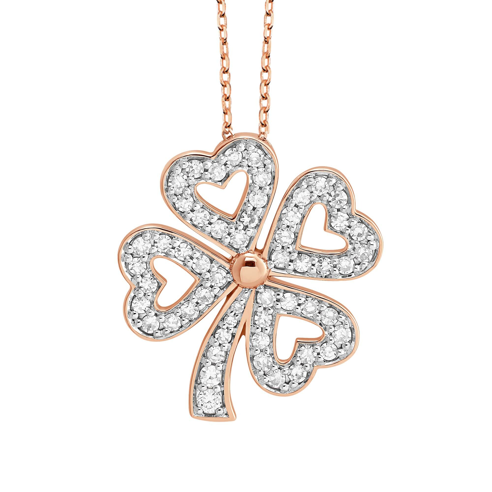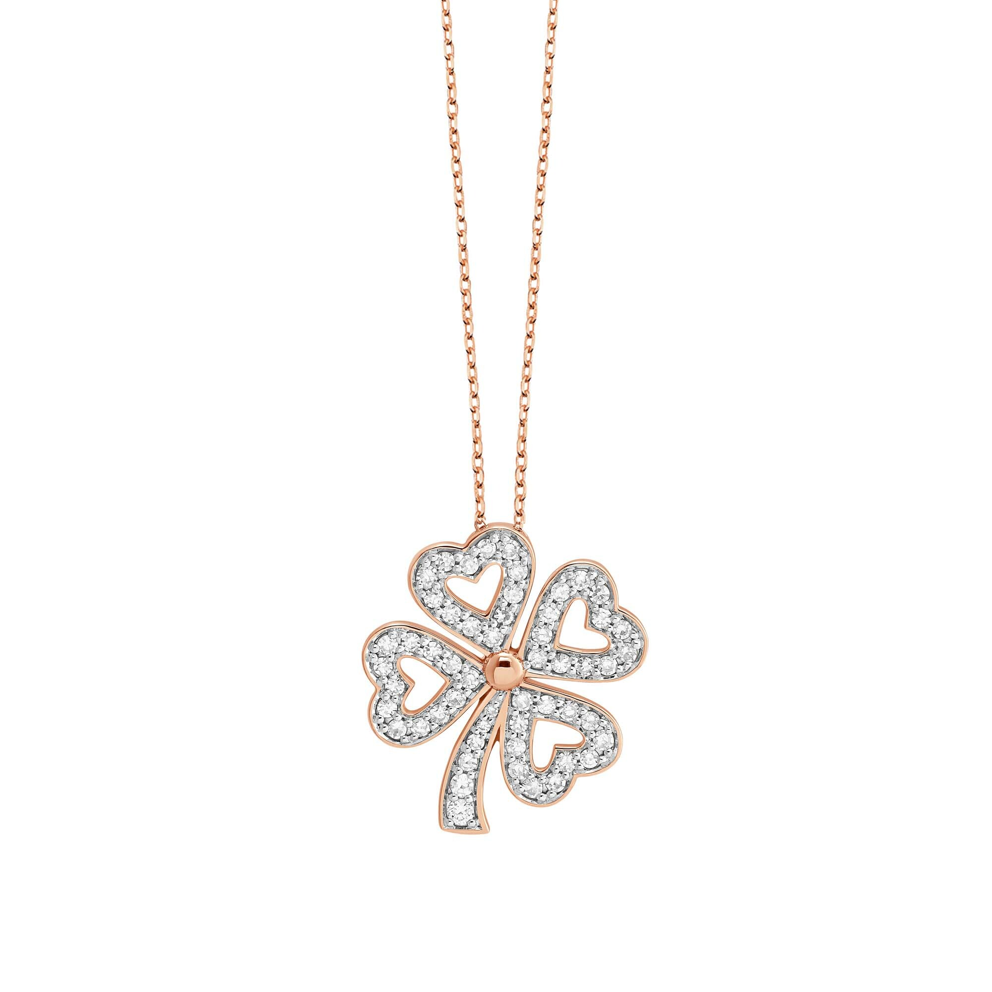 Ce collier en or rose 18 carats est orné d’un pendentif en forme de trèfle, symbole de chance et d’élégance. Chaque feuille du trèfle est délicatement sertie de diamants étincelants, ajoutant une touche de brillance à votre look.